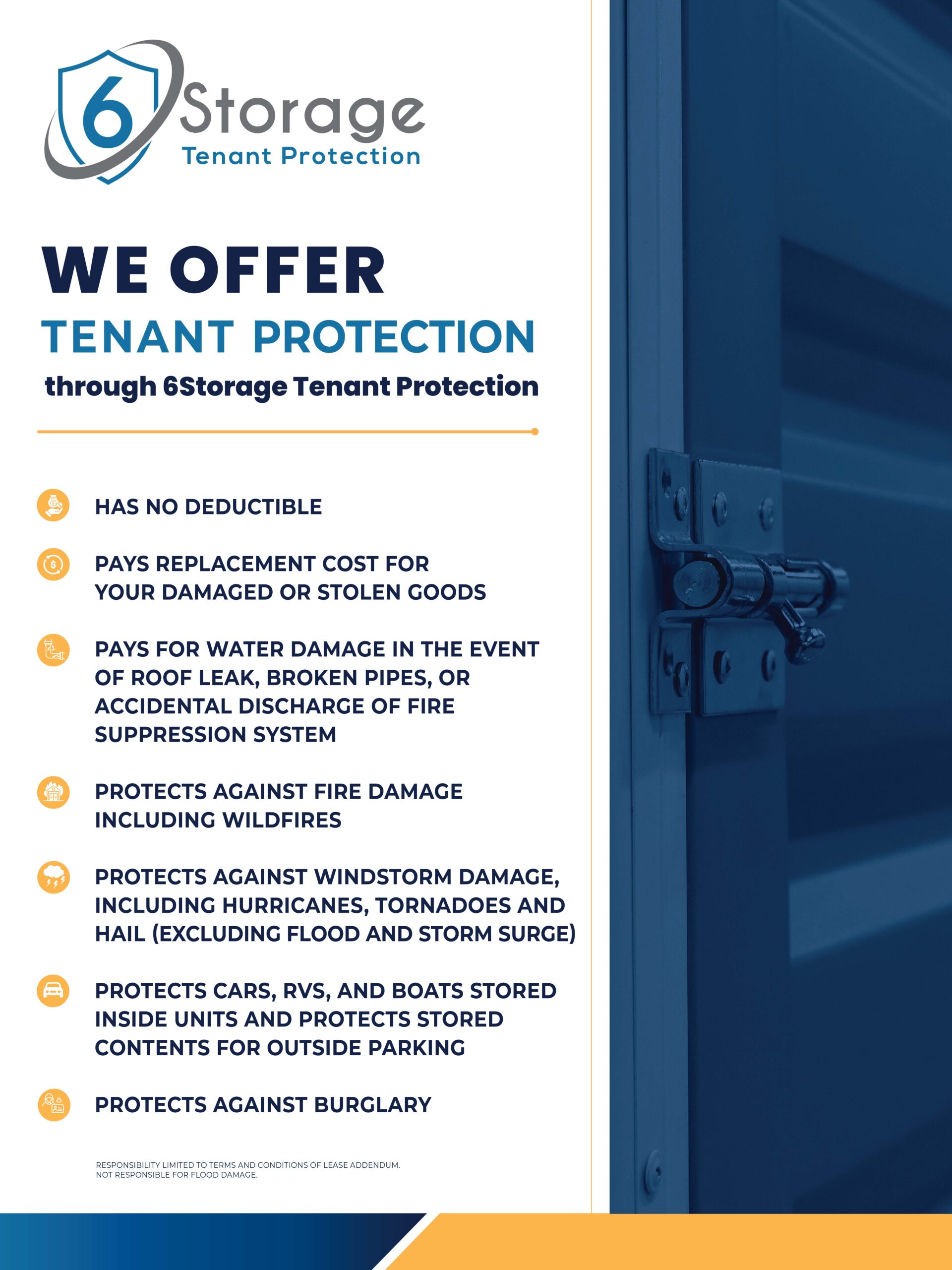 2. Tenant takes photos of any damage to their items and the storage unit. Please take photos of the source of damage if possible and do not throw anything away until the facility manager or owner has been notified.